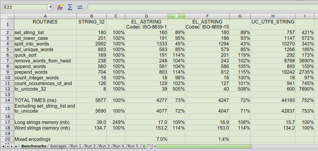 These are the results of the benchmark tests averaged over 5 runs. The full spreadsheet is available in project download (see end). Each test has a relative performance figure that is relative to the STRING_32 time. The relative memory figures are relative to UC_UTF8_STRING.