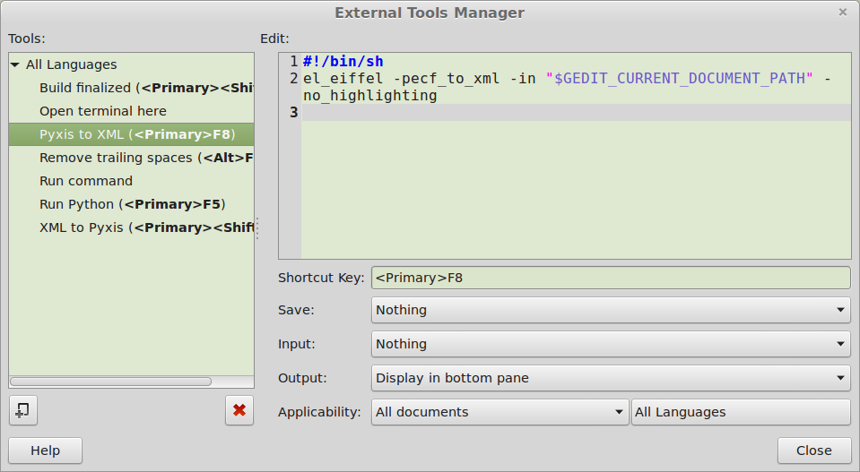 Because the Windows version of gedit does not support the external tool options, I have also integrated it with the file context menu on Windows platforms. Presented here are examples of the Pyxis form paired with the resulting XML expansion.