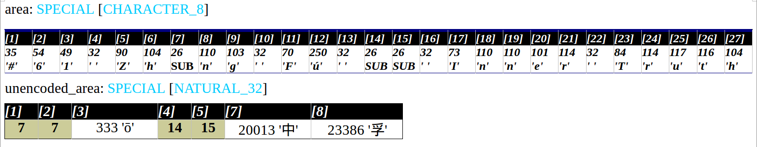 This array is used to store any characters that are not encodeable by the latin codec. The array is structured as a sequence of substrings. The first two cells of each substring record the indices defining the substring interval. As an example to illustrate, consider the string:
