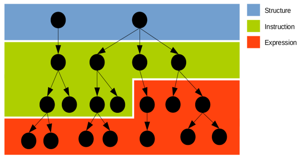 Inline agents allow instructions to appear in expressions. This breaks the invariant that expressions are always below instructions in the tree. Instead, we now have the ability to freely switch between instructions and expressions while going down the tree, resuling in the following structure: