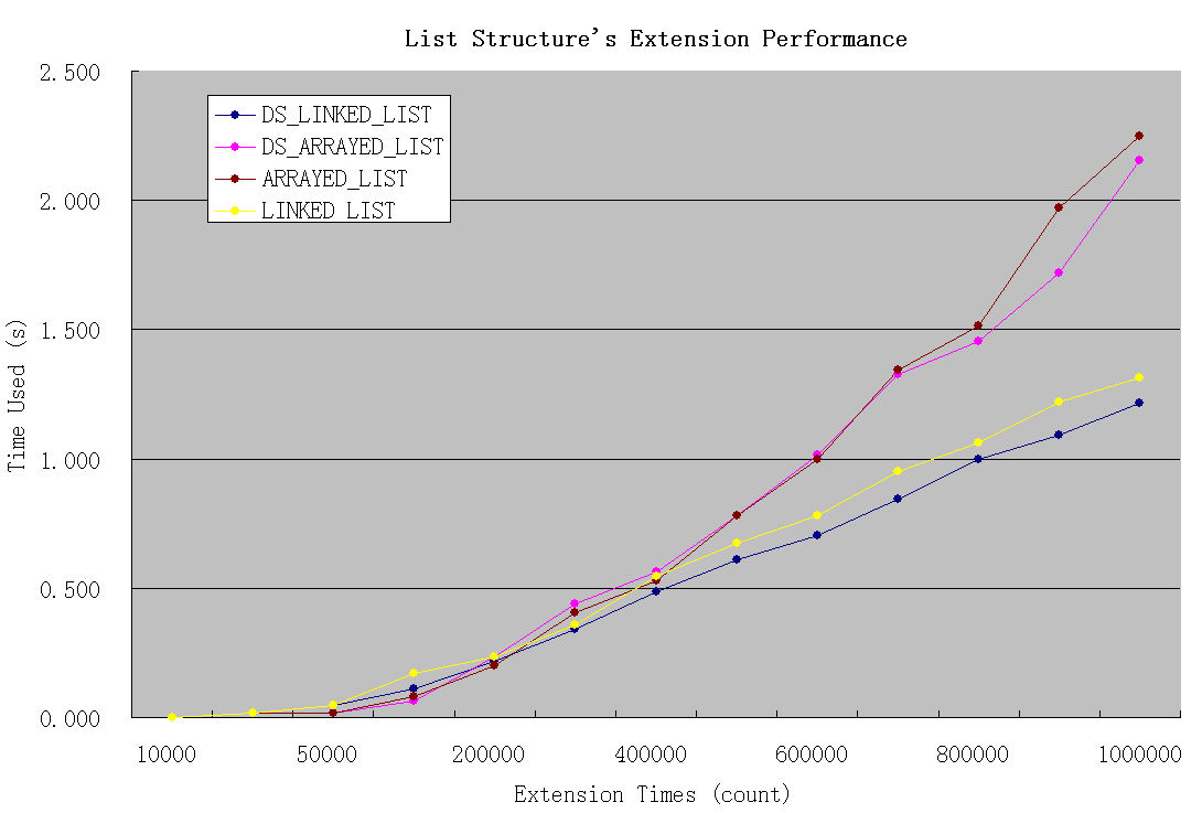 * When the number of extension elements raises to more than 200,000, DS_LINKED_LIST starts to show its best performance.