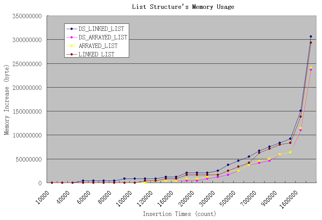 I didn't preallocate a size for arrayed lists. Firstly, I wanted to test the situation I completely don't know how many elements there would be. In practice, however, we can approximately evaluate the number of elements to be used. Secondly, yes, no doubt, the arrayed list is much faster and uses less memory, when known size is preallocated. That is an easy situation, if elements of the list are not frequently inserted/removed/moved, I choose that way without problem.<br> Now even I don't preallocate size for arrayed lists, they seem faster when I know the number of elements is not too huge. That's to say, no matter if I preallocate the size, it is better to use arrayed lists as long as not many elements and no element moving around.<br> When the number is very large, the big memory block reallocation is very slow for arrayed lists, so linked lists become faster since they only allocate small blocks of memory.